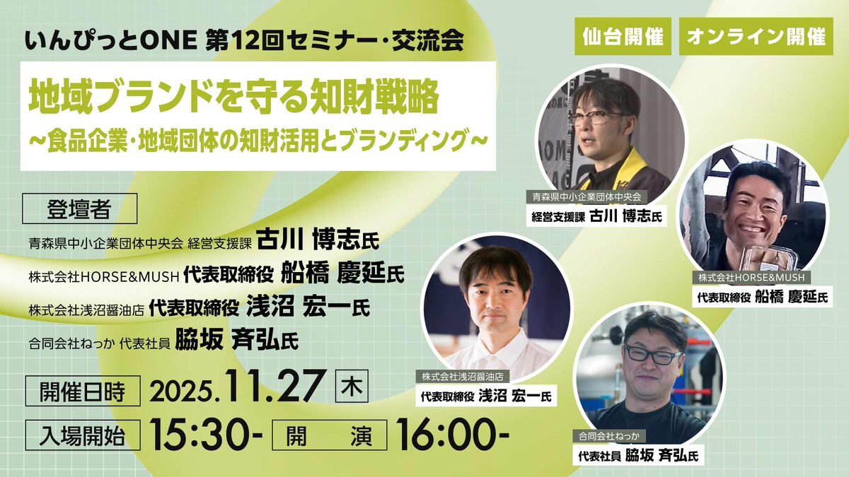 🌟申込受付中🌟 「#いんぴっとONE」第12回セミナー・交流会@仙台+オンライン 地域ブランドを守る知財戦略 ~食品企業・地域団体の知財活用とブランディング~ 東北の #地域団体商標#食品企業#知財活用#ブランディング の成功事例をご紹介! リアルな実践内容をお届けします👀 pic.x.com/Bfcwf4M3nd