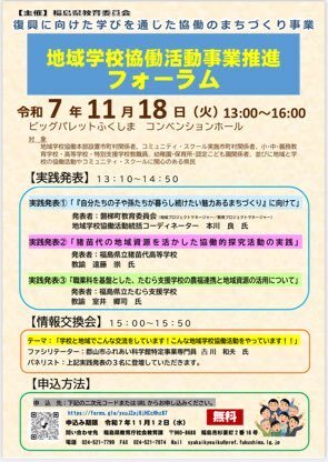 【お知らせ】令和7年度地域学校協働活動事業推進フォーラム 令和7年11月18日(火)13時〜 ビッグパレットふくしま 「猪苗代高校における『地域との学び』」についてお話させていただきます。 お時間ありましたらぜひ↓ pref.fukushima.lg.jp/site/edu/tiiki…【予約はこちらから】 #地域探究 #予約12日まで pic.x.com/adRcEDi0kC x.com/inako_tan9/sta…