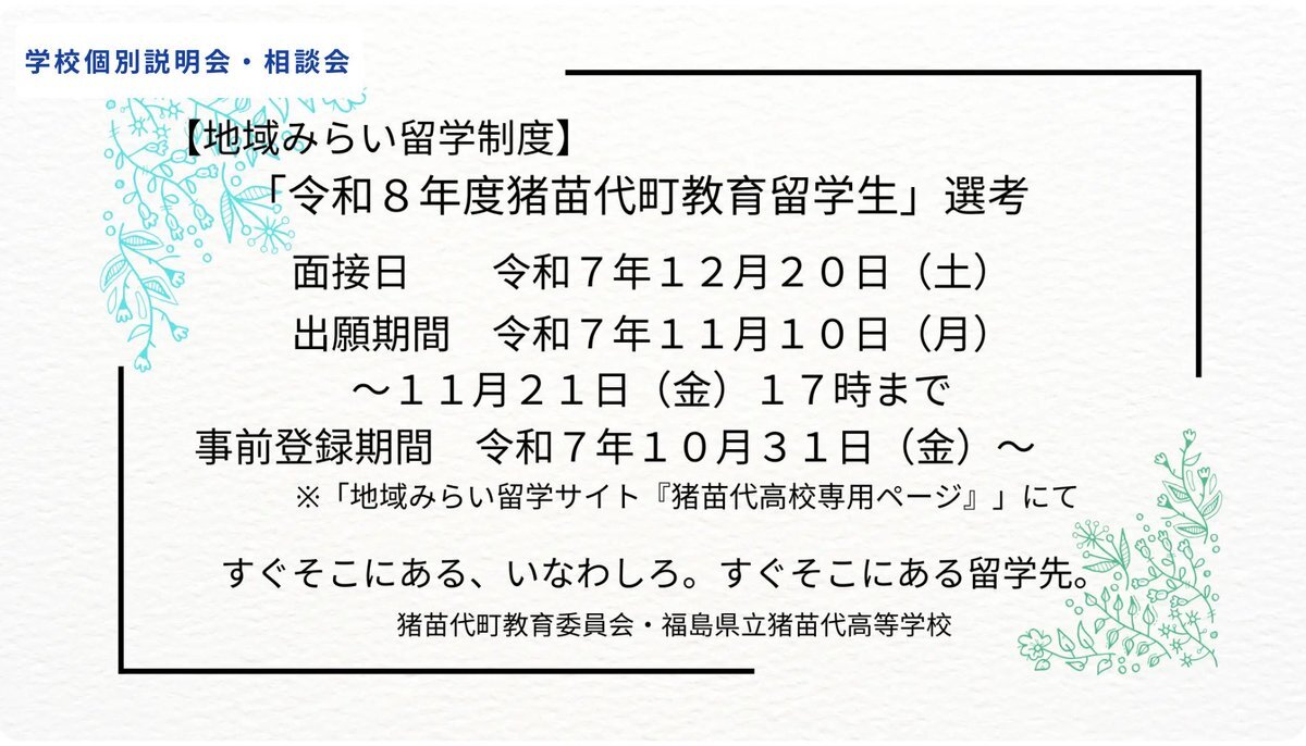 【#地域みらい留学 中学生・保護者の皆さまへお知らせ②】 3年間の生活費について猪苗代町から助成を受けるための面談が開催です。 面談を受けるための出願期間は残すところ1週間。週末、家族とじっくり話してみてください。たくさんの出願お待ちしています👇 c-mirai.jp/events/002612 #地域探究 pic.x.com/wZ48t5M7Y4 x.com/inako_tan9/sta…