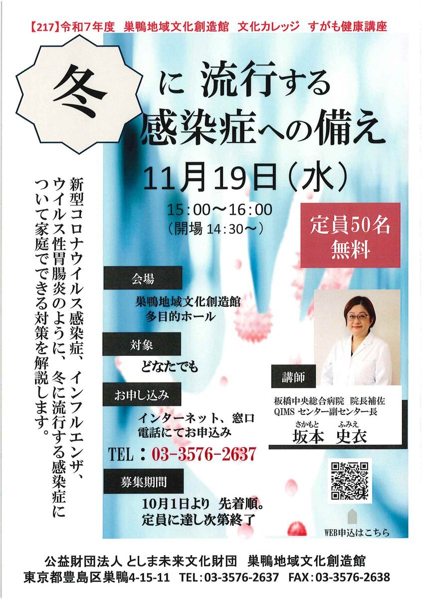【講座情報】 すがも #健康講座「冬に流行する感染症への備え」 11/19(水)開催🎉 若干お席に余裕があります。 新型コロナ、インフルエンザ、ウイルス性胃腸炎など、家庭でできる冬の #感染症対策 を解説します。 詳細・申込⬇️ toshima-mirai.or.jp/tabid216.html?… #豊島区 #巣鴨 #地域文化創造館 pic.x.com/cjPAlmb2k9