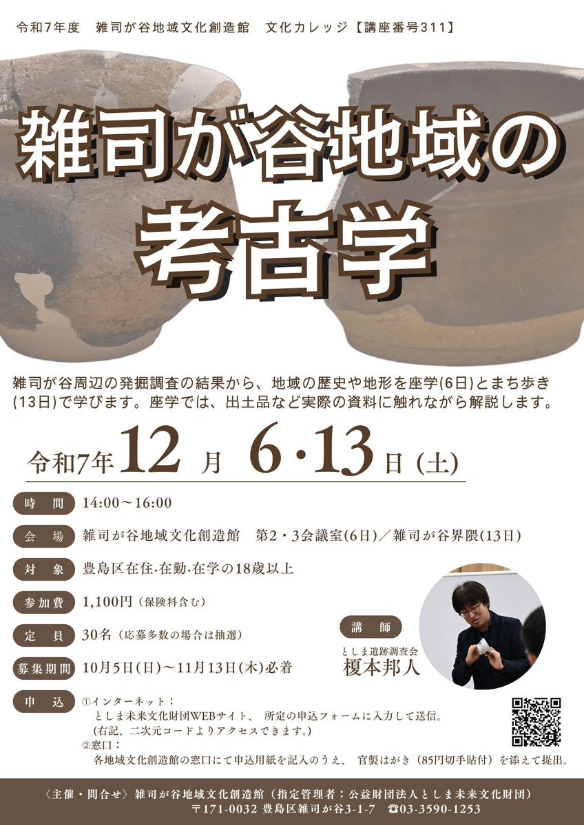 【講座情報】#文化カレッジ (311) 「#雑司が谷 地域の #考古学 」の締切は、11月13日(木)までです。どうぞお誘いあわせの上、ご参加下さい。くわしくは==>toshima-mirai.or.jp/tabid216.html?… #豊島区 #地域文化創造館 pic.x.com/aiR1y1E704