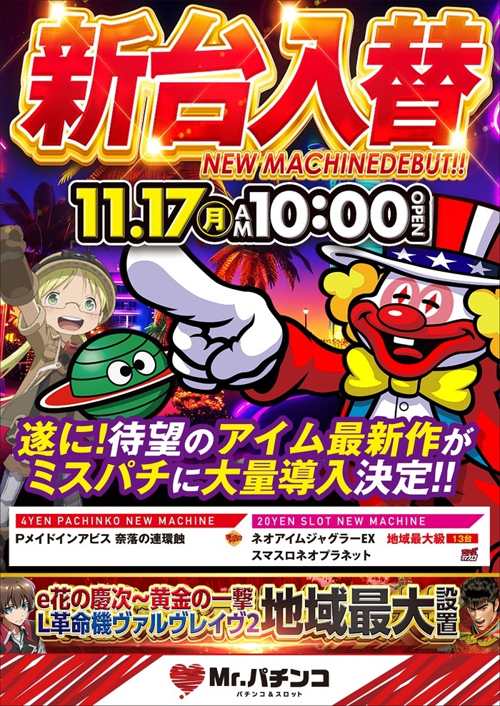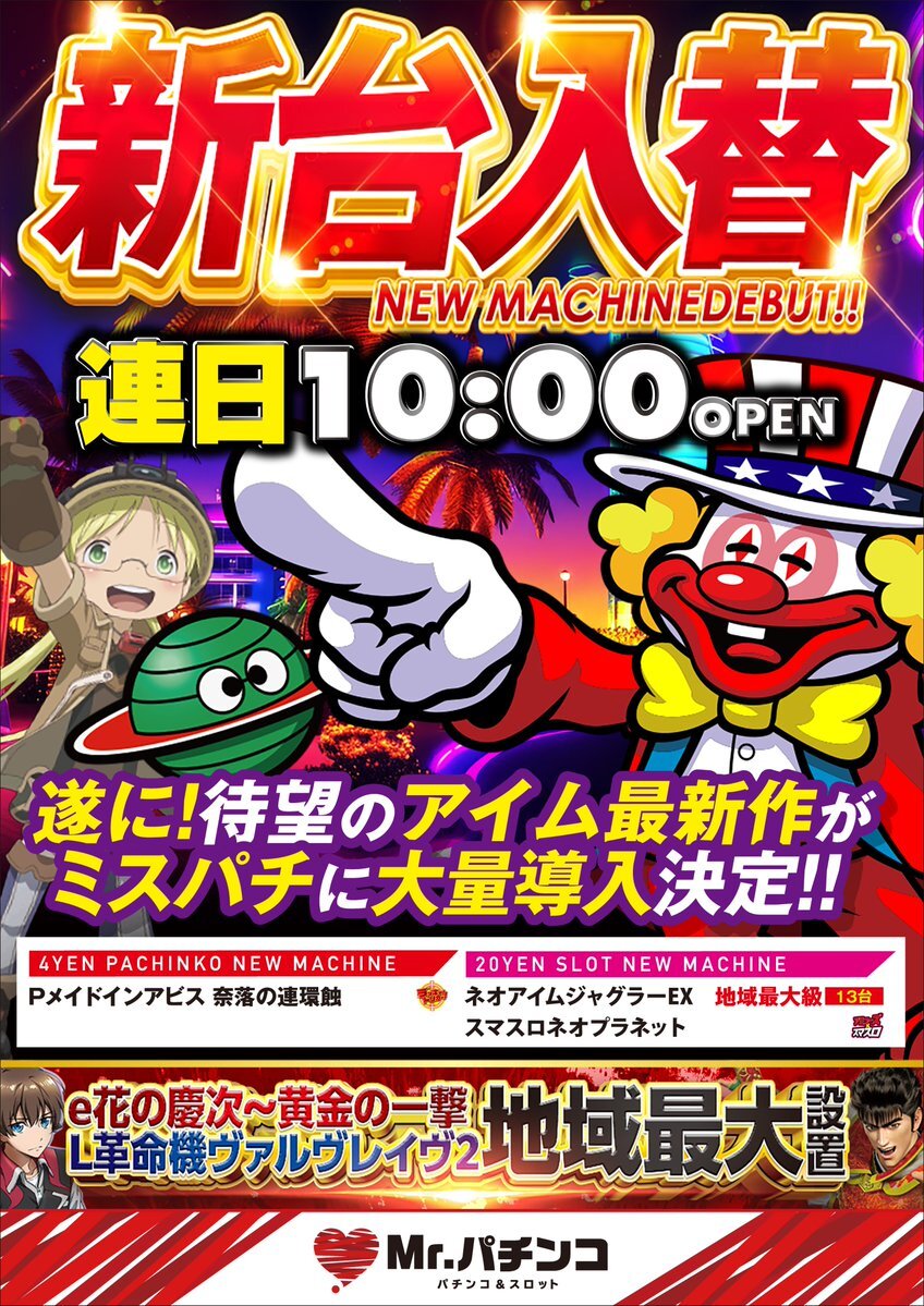 👑新台入替👑 1⃣1⃣月1⃣7⃣日【月】 1⃣0⃣時開店! 🤡アイム最新作🤡 /#ミスパチ に大量導入🔥/ /#ネオアイムジャグラー/ /#地域最大設置 1⃣3⃣/ その他最新台も導入!! ⚡明日はミスパチで決まり⚡ ご来店お待ちしております。 #泉大津 #ミスターパチンコ泉大津 #新台入替 #ジャグラー pic.x.com/LKXniE0EUc