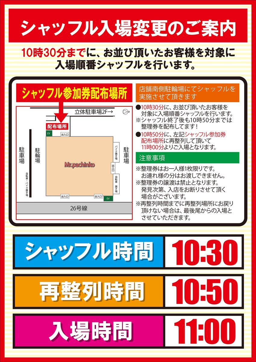 おはようございます! 🍀入場抽選は9:15~9:50受付けです ※1パチご希望の方は来店順に整理券配布 冷え込むようになってきました 朝並びも店内も暖かくしてお待ちしてます 今日もよろしくお願いします🧏‍♀️🎶 #地域最大設置 #ヴァルヴレイヴ2 pic.x.com/V5Ai7jMlnq