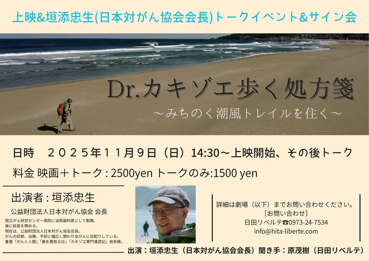 いよいよ来週!11月9日 ご予約受付中✨ 『Dr,カキゾエ 歩く処方箋』上映& Dr.カキゾエ(垣添忠生医師)トークイベント🎤映画を観て、垣添さんのお話を聞ける貴重な機会、ぜひご参加していただけると嬉しいです! #drカキゾエ歩く処方箋みちのく潮風トレイルを往く #垣添忠生 #日田リベルテ pic.x.com/eixOc6qWVU
