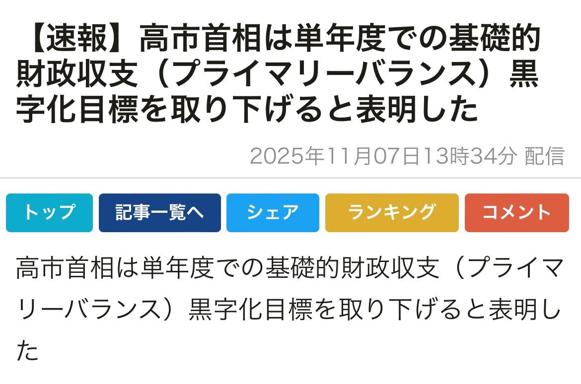 【速報】高市首相は単年度での基礎的財政収支(プライマリーバランス)黒字化目標を取り下げると表明した:時事ドットコム jiji.com/jc/article?k=2… #積極財政 #基礎的財政収支 #プライマリーバランス pic.x.com/aczoTh7Rlh