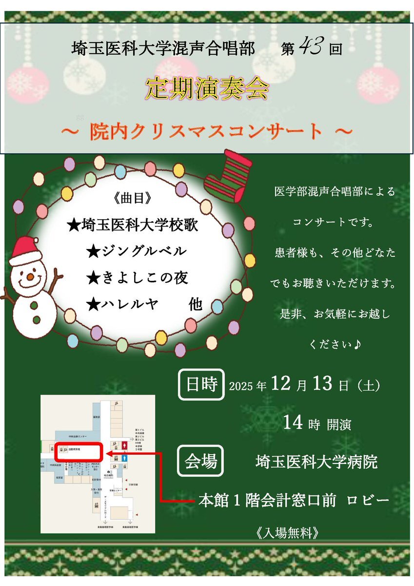 おはようございます!一気に冬の寒さがやってきましたね。気温変化に充分ご注意ください。 本日は♪ロビーコンサート♪のお知らせです。今回は本学の学生によるクリスマスコンサートになります。 お時間ございましたらぜひお立ち寄りください! #埼玉医科大学病院 #コンサート #癒しの音色 pic.x.com/LcvxdbsJBN