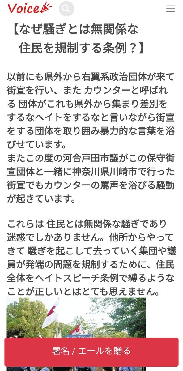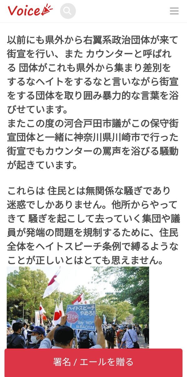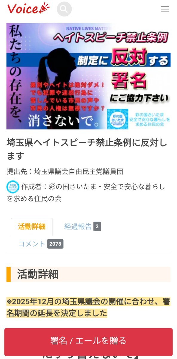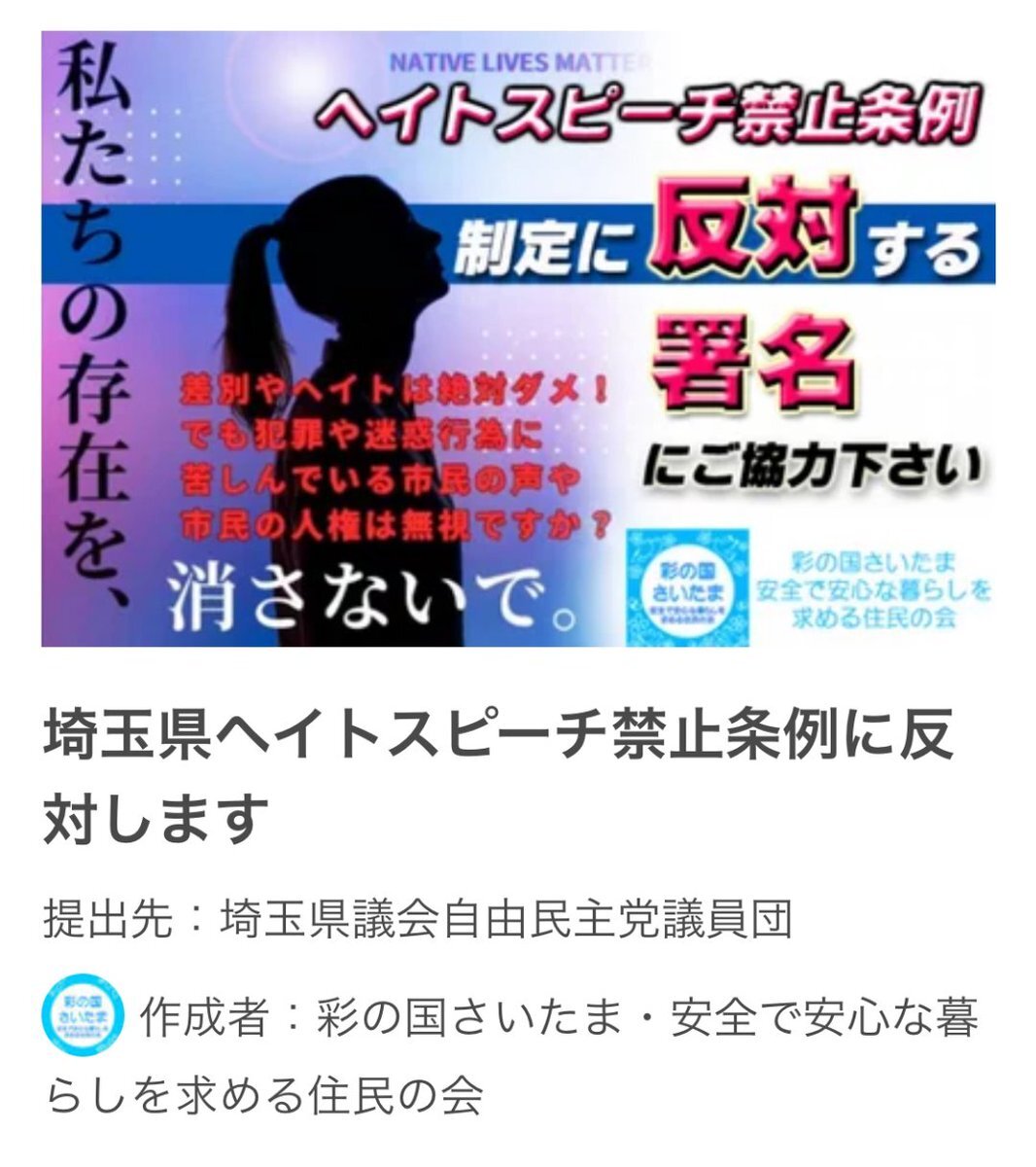#埼玉ヘイトスピーチ条例反対 極左埼玉自民党がプロジェクトチームを立ち上げ条例制定を目指して画策しています ヘイトスピーチ条例は日本生まれの日本人のみを罰する日本人への差別・口封じです 1万筆を目指しています 何卒、ご署名のご協力をお願い致します voice.charity/events/5248