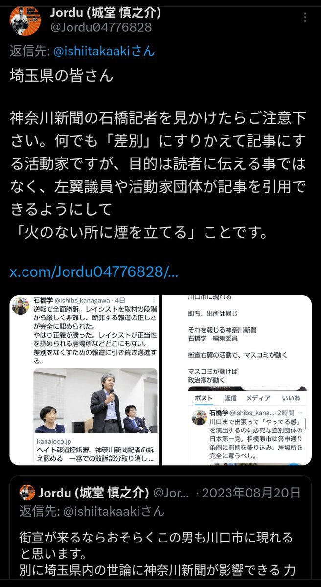 返信先:@SUGIYAMA766仰る通りです 相模原ヘイト条例で敗走し次のヘイト条例制定ターゲットとして川口市で『外国人ヘイト』と喚く石橋記者を追撃する神奈川グループと 埼玉迷惑被害住民の連合軍で #埼玉県ヘイトスピーチ条例反対 署名活動を行なっています 署名入口⬇️ voice.charity/events/5248 x.com/Jordu04776828/… pic.x.com/RVgg8wybPS