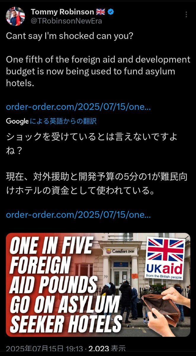 『現在、対外援助と開発予算の5分の1が難民向けホテルの資金として使われている』 なぜイギリス人は文句を言わないのか❓ #ヘイト禁止法 で逮捕されるので「言えない」のです。 自民党県議団が準備中の #埼玉県ヘイトスピーチ条例反対 署名にご協力下さい 📝署名入口⬇️ voice.charity/events/5248 x.com/TRobinsonNewEr…