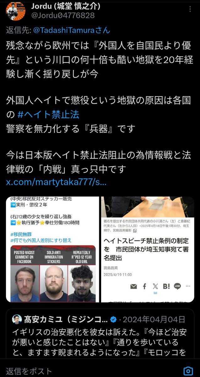 返信先:@Expressors333その心意気には賛同します。 イギリスが移民に乗っ取られた理由は #法律戦 に負けたからです。ヘイト禁止法の為に警察は不法移民でなく住民を逮捕します。 河合ゆうすけ氏が誘導するヘイト禁止法が決まれば埼玉県警は移民でなくあなたを逮捕します。 ぜひ法律戦にも関心を x.com/Jordu04776828/…