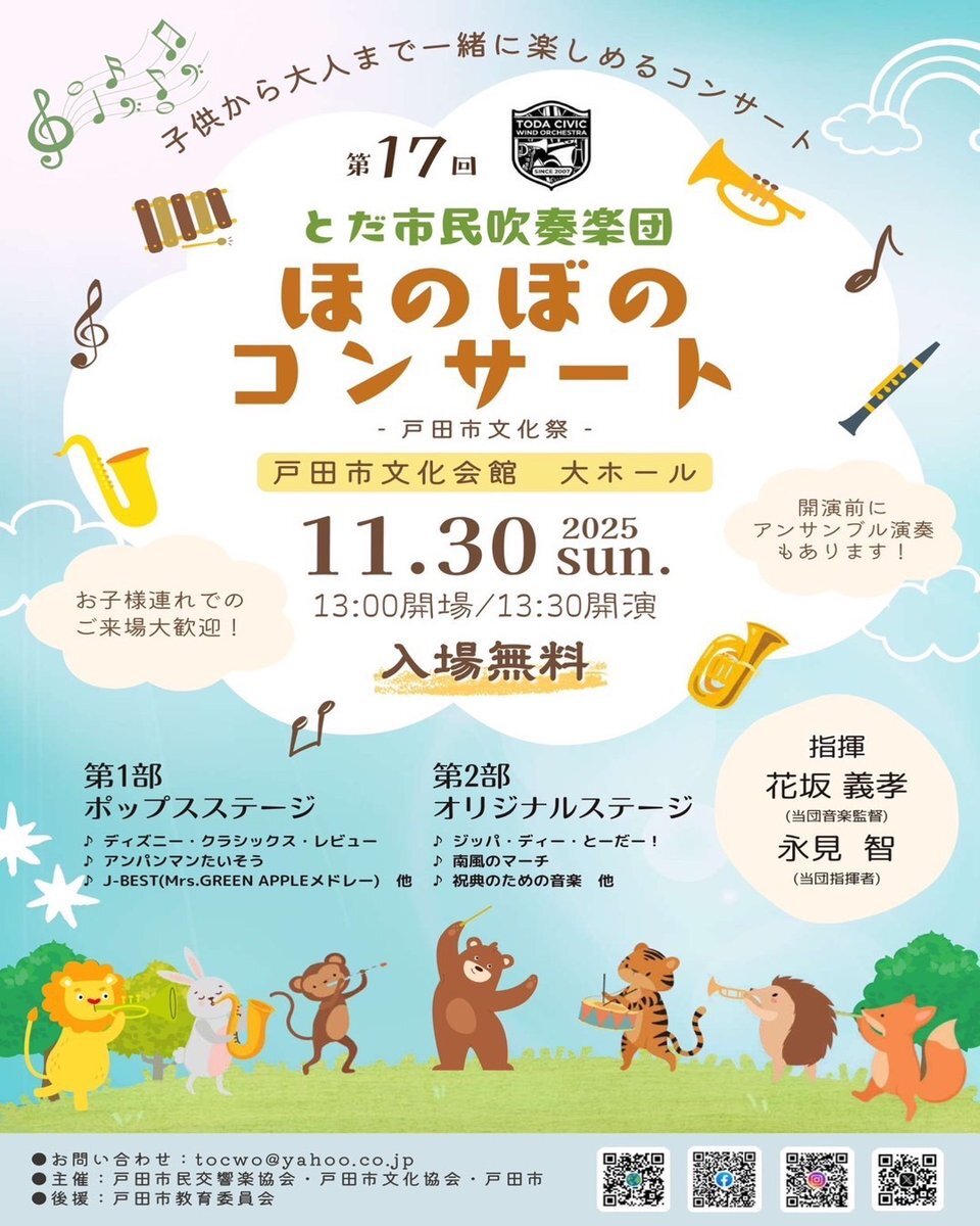 【演奏会のお知らせ!📢】 とだ市民吹奏楽団 第17回ほのぼのコンサート 2025年11月30日(日) 戸田市文化会館 13:00開場 13:30開演 ※開演前にアンサンブル演奏もあります! 小さなお子様連れでのご来場大歓迎!👶👦👧🧒 #とだ市民吹奏楽団 #tocwo #吹奏楽 #吹奏楽団 #埼玉県戸田市 #戸田 pic.x.com/5oncK7eapY