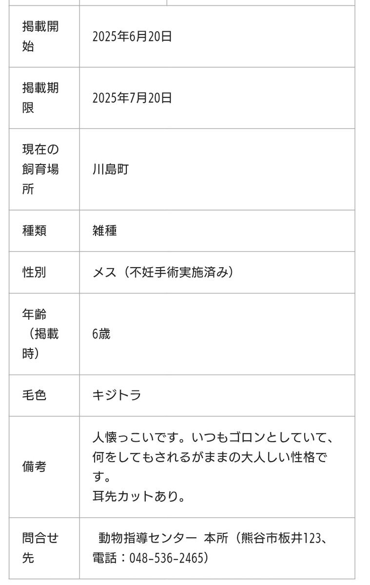 #埼玉県 #埼玉県譲渡猫 #猫の飼い主さん募集 #譲渡猫 #譲渡可能猫 #家族募集 #里親募集 飼い主さんからの直接譲渡、センターは連絡先情報等の仲介のみになります 🔴問い合わせ先🔴 埼玉県動物指導センター本所 ☎048-536-2465 pref.saitama.lg.jp/b0716/doubutu-… pic.x.com/SDStp4h6EJ