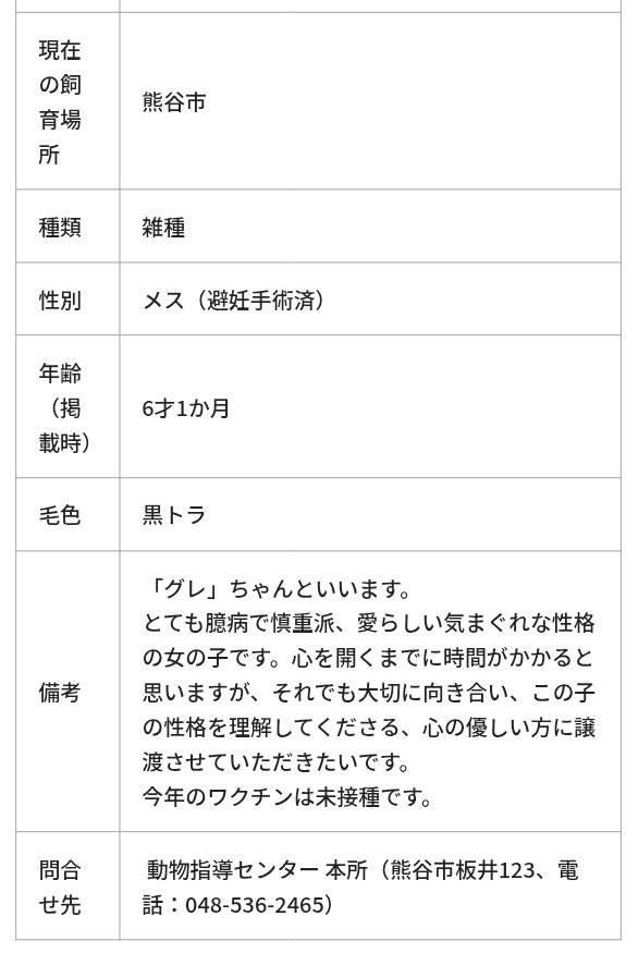 拡散希望📣📣📣 #埼玉県 #埼玉県譲渡猫 #譲渡猫 #譲渡可能猫 #家族募集 #里親募集 飼い主さんからの直接譲渡、センターは連絡先情報等の仲介のみになります 🔴問い合わせ先🔴 埼玉県動物指導センター本所 ☎048-536-2465 pref.saitama.lg.jp/b0716/doubutu-… 🟢グレちゃん🟢 pic.x.com/IafsISodCC