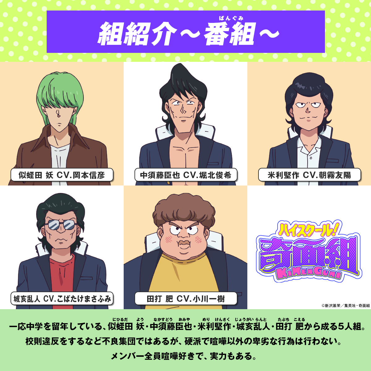 【番組】のメンバー&キャストはこちら!🏍 〇 似蛭田 妖 CV #岡本信彦 〇 中須藤臣也 CV #堀北俊希 〇 米利堅作 CV #朝霧友陽 〇 城亥乱人 CV #こばたけまさふみ 〇 田打 肥 CV #小川一樹 キャラ名が読めない…🤔 と思った人は👇👇 #ハイスクール奇面組 pic.x.com/utHTe5rAyz