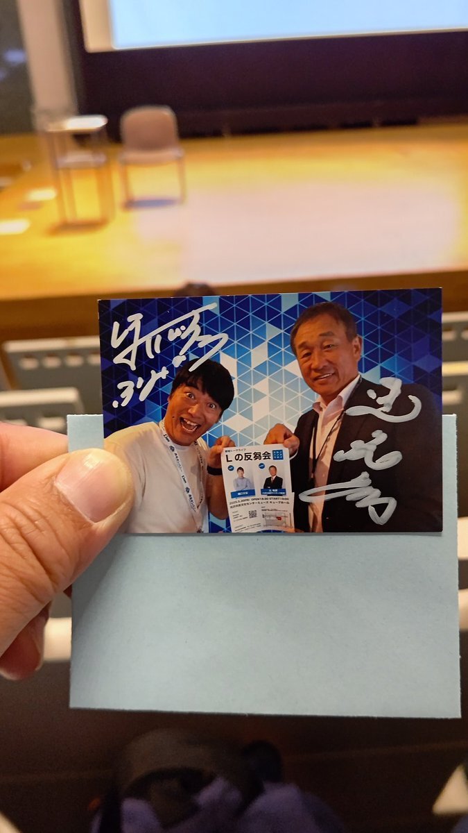 会場内に入りました。 入場特典のカードは٠٠٠。 な、なんとっ!! 堀口さんと辻さんのツーショットッ!! しかも、直筆サイン入り~っ!! 今回は【あたり】カードもあるみたいだが、こちらにとって直筆サイン入りカードが当たりです。 #Lの反芻会 #堀口文宏 #辻発彦 #ハンスウ pic.x.com/6f84B2omDK