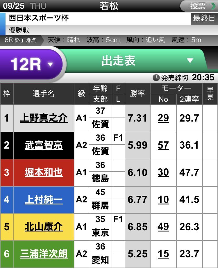 🌉若松🍍ナイター🌠 西日本スポーツ杯 ┈┈┈┈┈┈┈ 明日(9月25日) 注目の優勝戦🏆 ┈┈┈┈┈┈┈ 締切予定時刻20:35 12R👑 ①上野 真之介(佐賀) ②武富 智亮(佐賀) ③堀本 和也(徳島) ④上村 純一(群馬) ⑤北山 康介(東京) ⑥三浦 洋次朗(愛知) 🏢本場開門 14:00 🚤1Rスタート展示 15:00