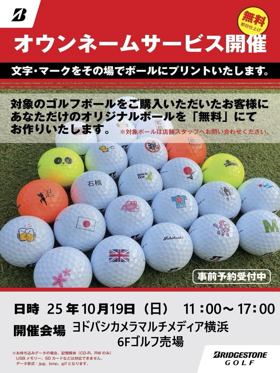 / オリジナルゴルフボール作れます⛳️ \ ブリヂストンゴルフ対象ボールをご購入で その場でボールに無料でプリントするイベント開催⛳️ お問合わせは6階ゴルフショップへ 事前ご予約承り中💁 🗓️10/19(日) 🕙11:00~17:00 📍6階ゴルフ売場 ➡️yodobashi.com/category/15202…