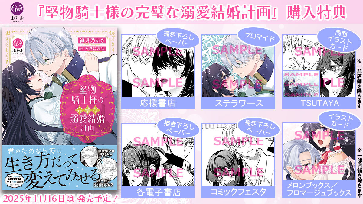 🍁11月刊 『#堅物騎士様の完璧な溺愛結婚計画』 #海月乃るき(@kuragenoruki) #八巻にのは(@2_8_gogo) opal-comics.l-ecrin.jp/work/30313?typ… ◤特典一覧を公開!◢ 💟応援書店👉buff.ly/3CNBxda 💟TSUTAYA※一部店舗除く 💟ステラワース 💟各電子書店 💟コミックフェスタ pic.x.com/f61mDi9k7l