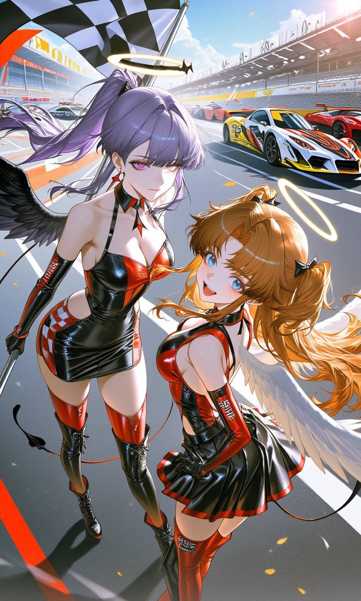 華金スペシャル、堕天使姉妹登場🔥✨ 次女エルミナはクールなまなざしで旗を掲げ、 三女ノアは褐色なしVerの可愛さ全開で笑顔を向けてくる。 夕陽のサーキットが一気に華やぐ――これが堕天使姉妹の“華金”。 #堕天使エルミナ #堕天使ノア #華金Ver #レースクイーン #AIアート pic.x.com/6JgNhVbeVN