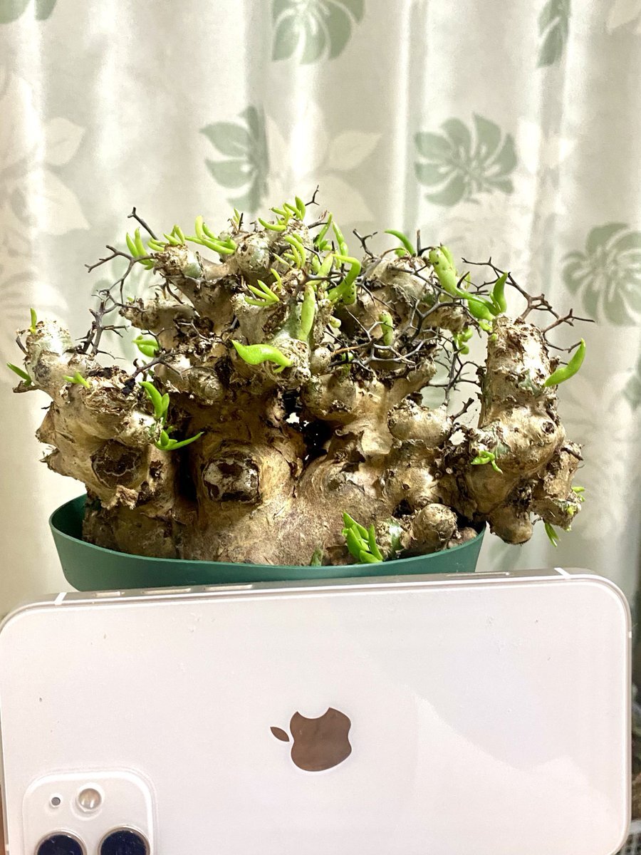 真夏に #万物想 の大株を腐らせてハートブレイク。諦めきれずにヤフオクでやや大きめのベアルート株を落札。15,000円。安い!返す刀で小さい発根済み株も落札。5,000円。安っ!ノーマルiPhoneと比較してみて。安い割には良いサイズよ。 #チレコドン・レティキュラータス #塊根植物 #観葉植物 pic.x.com/D1WqT0sB7j
