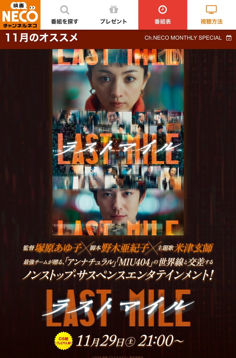 しっかり、ブラックフライデーの翌日に。 『 #ラストマイル』、CS 初OnAir🚚📦 11/29(土) 21:00〜23:15 #チャンネルNECO #野木亜紀子 #塚原あゆ子 #満島ひかり #岡田将生 #ディーンフジオカ necoweb.com/neco/osusume/ pic.x.com/jhOtMhI99P