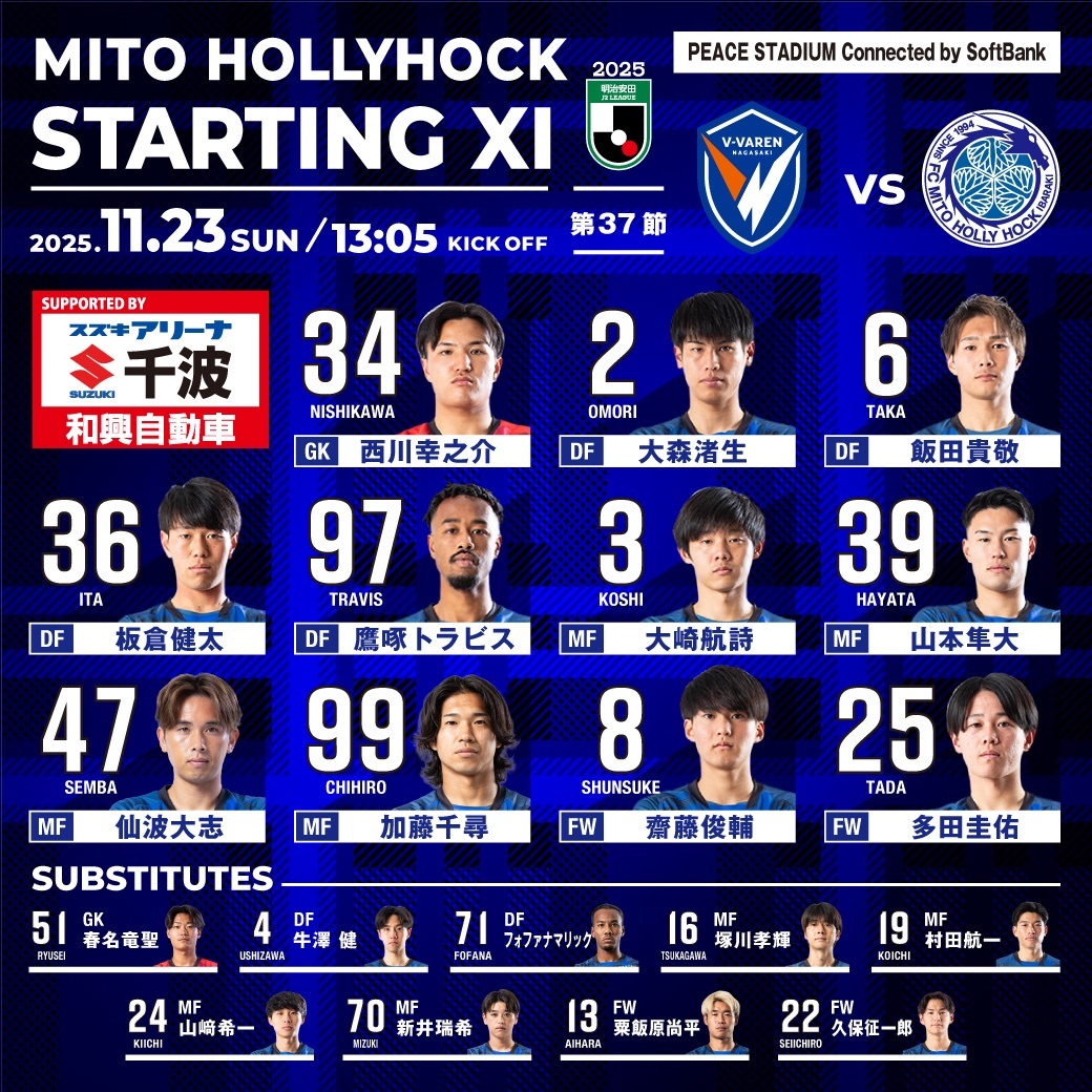 2025明治安田J2リーグ第37節 本日のスターティングメンバー リザーブメンバーの発表です💪❗️ 🆚#V・ファーレン長崎 🐲#水戸ホーリーホック ✅#1123長崎戦 ⌚11/23(日)13:05キックオフ 🎥#DAZN 視聴でクラブをサポート🔥 prf.hn/click/camref:1… #スポーツくじWINNER⚽購入でクラブが強くなる🔥