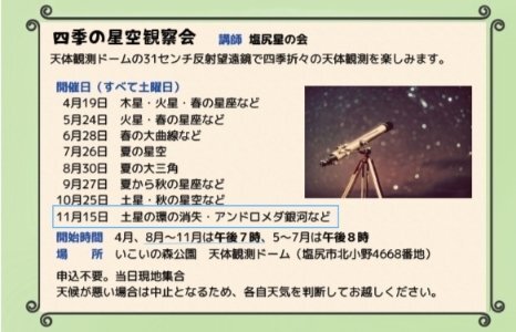 11月15日(土) 「四季の星空観察会」 時間:19時~ 場所:塩尻市いこいの森公園天体観測ドーム 講師:塩尻星の会 参加:無料 ※申込不要、当日現場集合、曇天・雨天中止 #塩尻市 #塩尻星の会 pic.x.com/8RGNBUk4OI