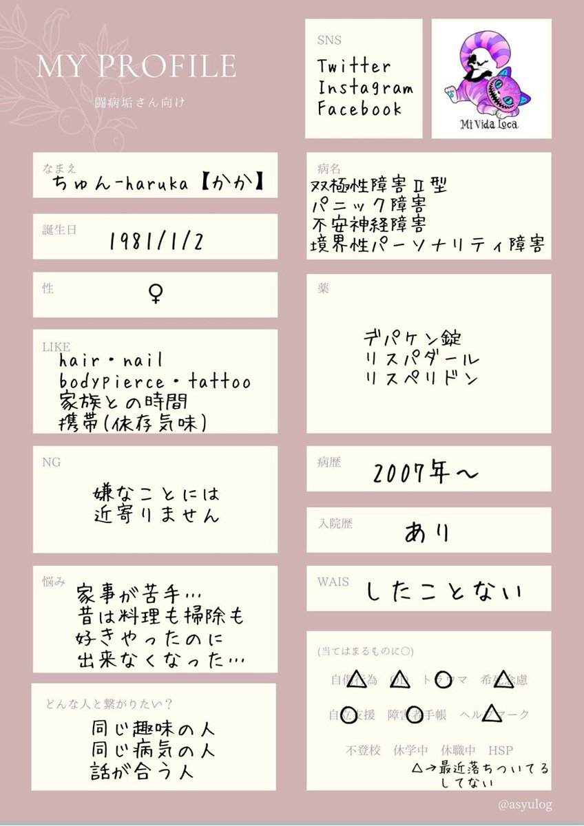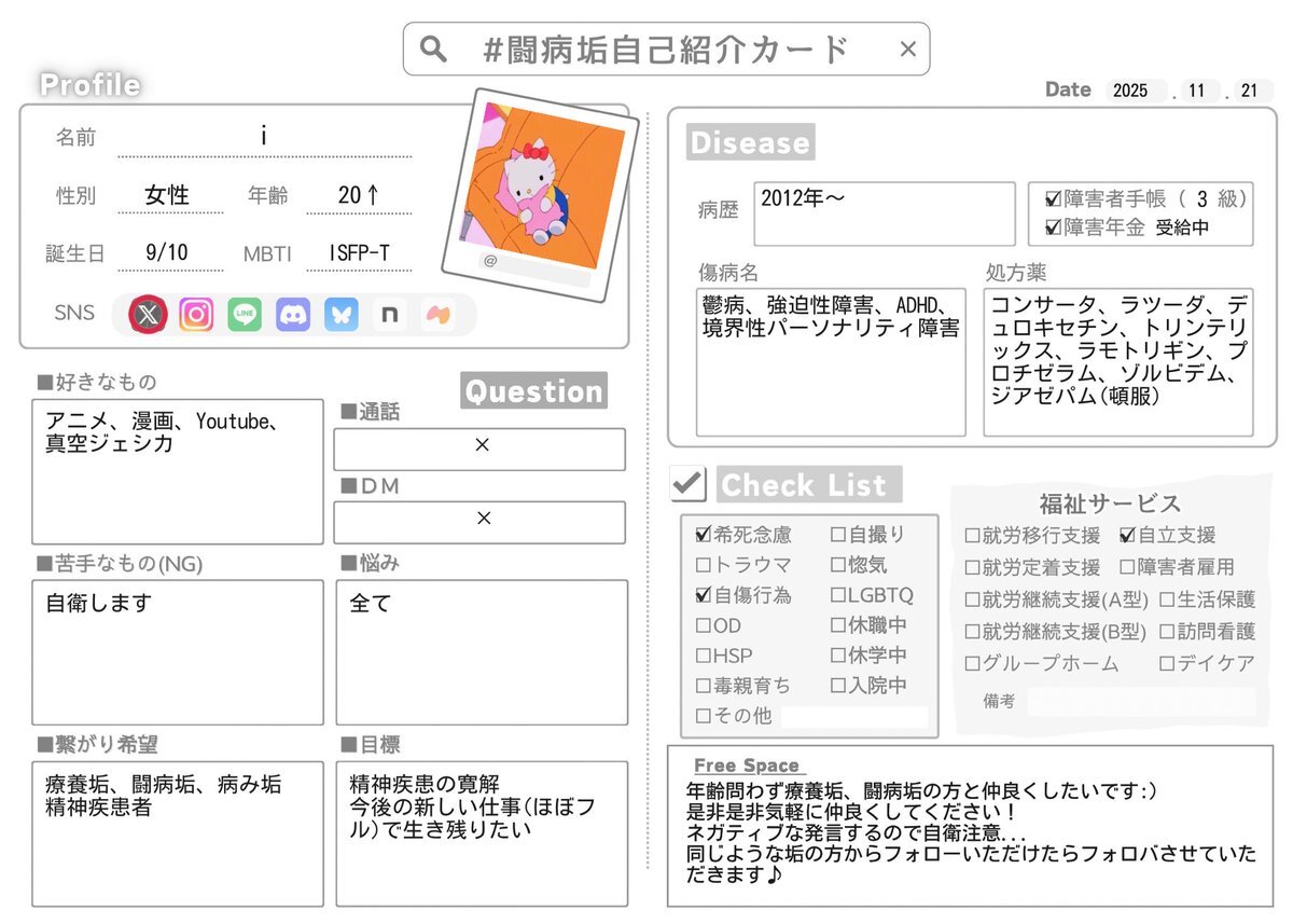 . 固定ツイ失礼しまつ🫶 闘病仲間とのゆるい絡み希望☺︎︎︎︎ 特に女の子は優先フォロバします🥺♥ 睡眠薬以外は基本断薬してまする #境界性パーソナリティ障害 #双極性障害 #闘病垢さんと繋がりたい #精神疾患を持つ方と繋がりたい #闘病垢自己紹介カード #精神疾患持ちのための自己紹介カード pic.x.com/X3f7m9KjyG
