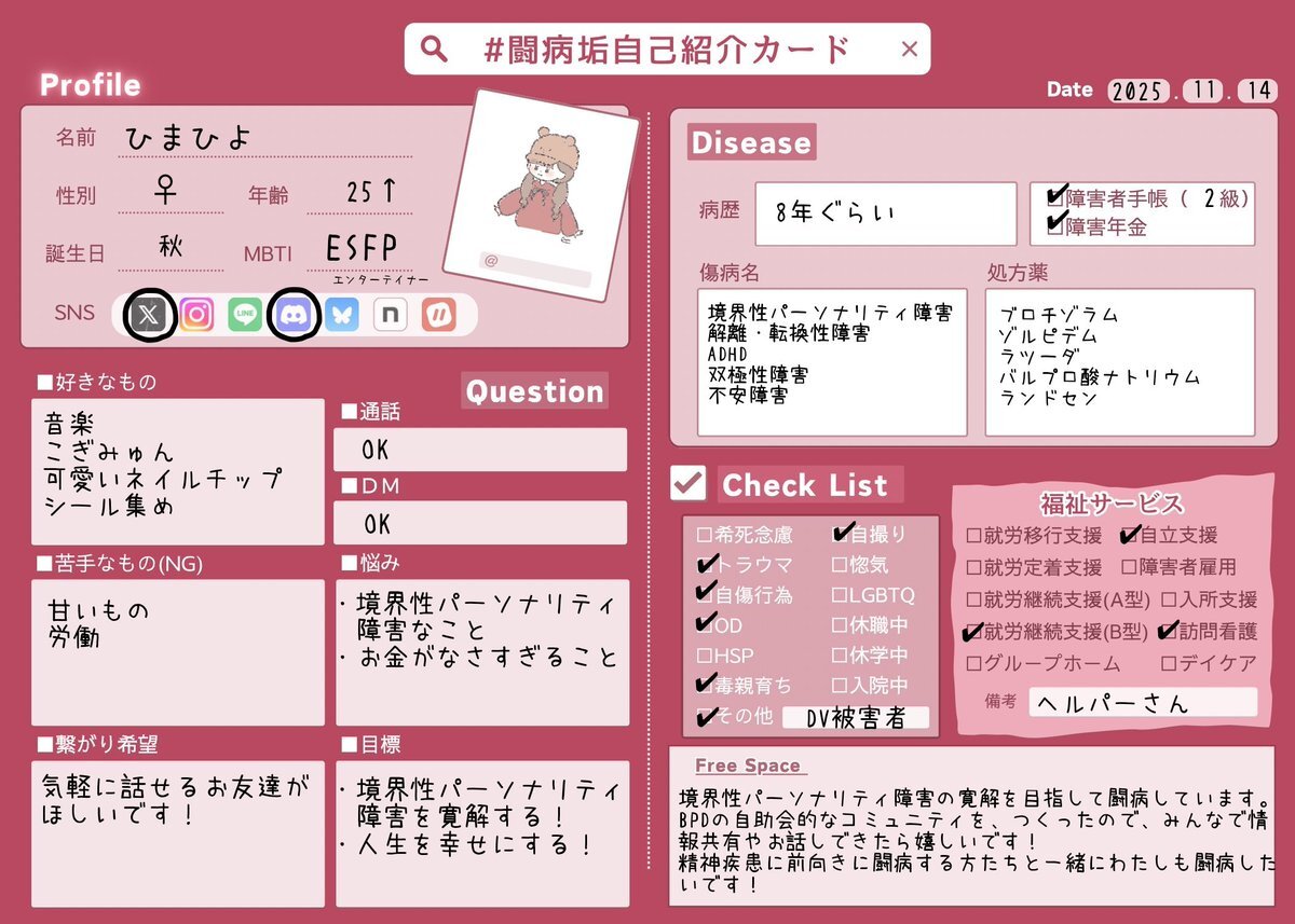 日常のポストが多いです( ˙꒳˙ ) 自発的に行くのは苦手やけど仲良くしてね✨ 反応してくれたりいいねくれた人、気になる方はお迎え行きます(*ˊᵕˋ*♡ #闘病垢 #闘病垢さんと繋がりたい #闘病垢自己紹介カード #双極性障害 #うつ病 #パニック障害 #不安神経障害 #境界性パーソナリティ障害 pic.x.com/LJf43dNuSD