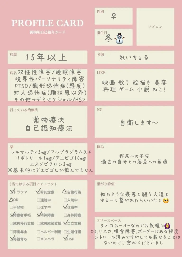 いろいろ変わったので上げなおし #境界性パーソナリティ障害 を寛解したい25↑の♀︎です!関西人です 仲良くしてくれたら嬉しいです(⋆ᴗ͈ˬᴗ͈)”よろしくお願いします🍀 少数精鋭で大切にしていきます🌻 #闘病垢自己紹介カード #闘病垢さんと繋がりたい #闘病垢さんと仲良くなりたい #精神疾患 pic.x.com/ATRweIvmm7