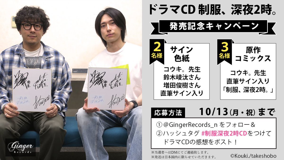 ドラマCD「制服、深夜2時。」 ˗ˏˋ ㊗️発売記念キャンペーン開催中 ˎˊ˗ #コウキ。先生 #鈴木崚汰 さん #増田俊樹 さん サイン入り色紙 ☞抽選で2名様に🎁 #コウキ。先生 サイン入りコミックス ☞抽選で3名様に🎁 ❶@GingerRecords_n をフォロー ❷#制服深夜2時CD で感想をポスト .ᐟ.ᐟ 10/13まで⋰ pic.x.com/PKhgYvIlRh