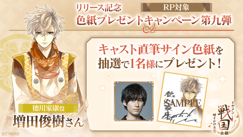 ⚔リリース記念色紙プレゼントキャンペーン第九弾⚔ #イケメン戦国永縁 遂に配信開始! 徳川家康役 #増田俊樹 さん 直筆サイン色紙を1名様にプレゼント🎁 ■応募方法 ①このアカウントをフォロー ②このポストをRPで応募完了! 応募期限:9/14(日)23:59 ▼DLはこちら app.adjust.com/1pyn4f0e
