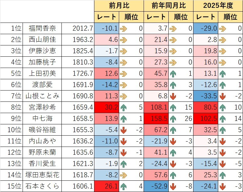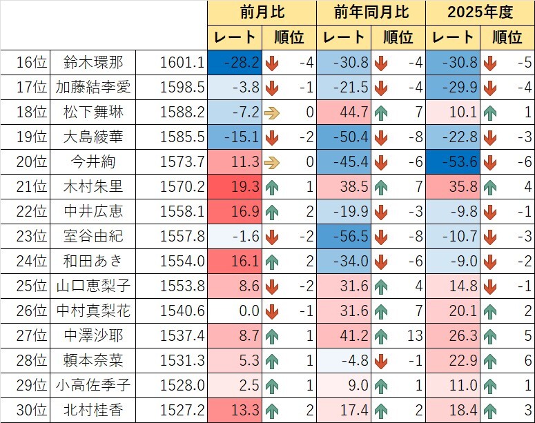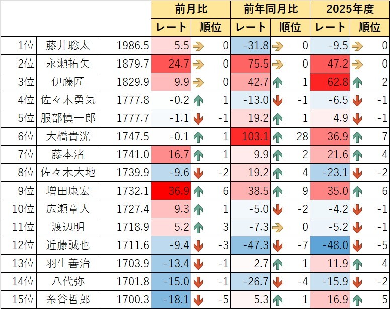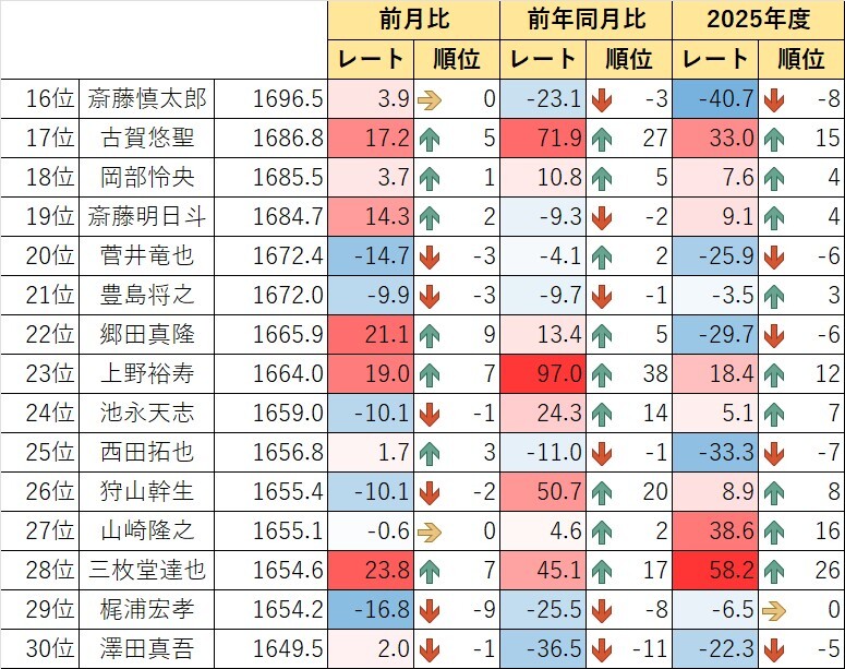 11/1現在 レートランキングトップ30 棋士では #永瀬拓矢 九段が月間5勝で大幅上昇。 1位との差を110ほどに縮めました。 #増田康宏 八段も月間6勝の 急上昇でトップ10入りです。 女流棋士では #宮澤紗希 女流初段がトップ10入り。 暫定首位の女流名人リーグでは 初挑戦が期待されます。 pic.x.com/byCR0ECqBA