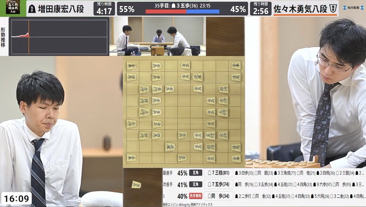 9:50〜4:00 AbemaTV「第84期 順位戦A級 5回戦 佐々木勇気八段 対 増田康宏八段」abema.tv/channels/shogi… 9:45〜 YouTube「増田康宏八段ー佐々木勇気八段【第84期将棋名人戦・A級順位戦】」buff.ly/xWmy7lA #将棋 #第84期順位戦 #佐々木勇気 #増田康宏