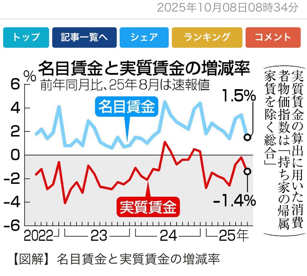 実質賃金8ヶ月連続マイナスとか言ってるけど 24ヶ月連続マイナスだったあと、何回かプラスになっただけの8ヶ月だからね 一時の上げを除けば3年以上ずっとマイナス これで岸田石破はよくやったとか万博成功とか言ってる連中は頭おかしいんじゃないのか?