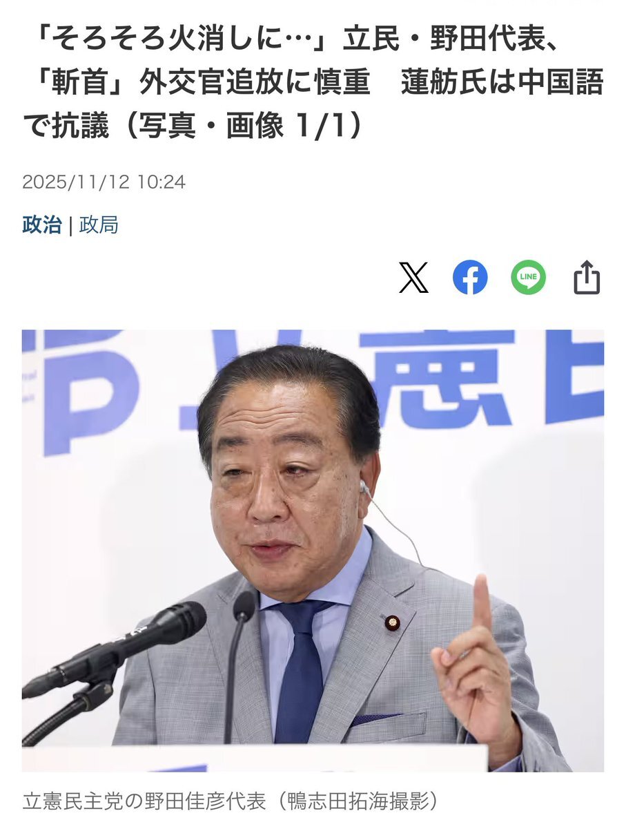 【そろそろ火消しを】薛剣・駐大阪中国総領事の𝕏でのポストで、自民党・小林鷹之政調会長の『ペルソナ・ノン・グラータ指定を含む毅然とした対応を政府に求める』発言に、立憲民主党・野田佳彦「気持ちはわかるがそろそろ火消しにあたって行かないと、PNG指定するとどんどんエスカレートしていく」