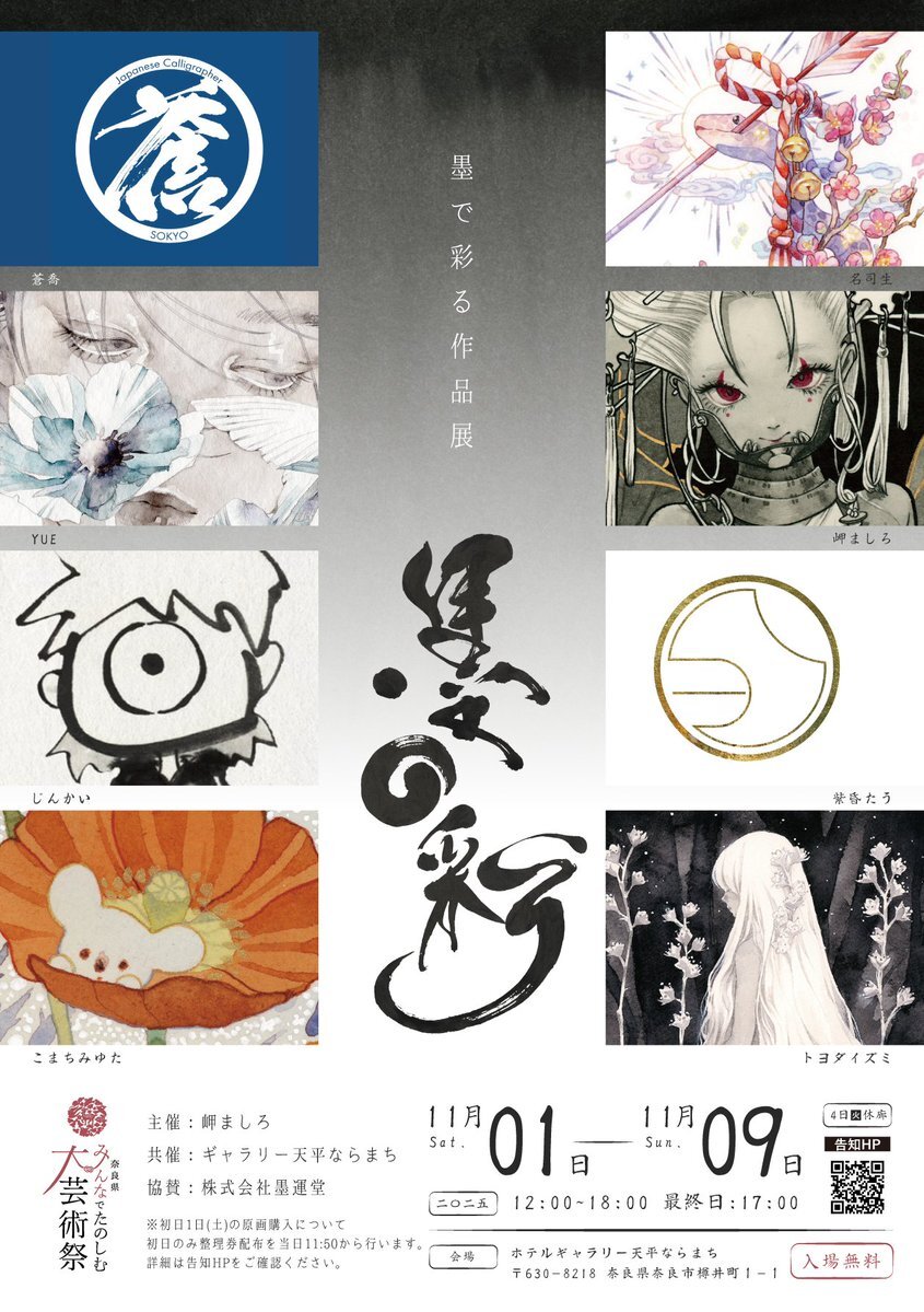 墨で彩る作品展『墨の彩2025』が奈良・ホテルギャラリー天平ならまちで、今年も明日11/1(土)から開催されます!第4回目の本展は8名の作家様の作品がご覧いただけます!(リプ欄に耳より情報続きます‥!) 墨の彩2025 公式サイト monokuroism.com/suminoiro2025 #墨の彩展 #奈良 #墨 #絵墨 pic.x.com/LvRcmivKKW