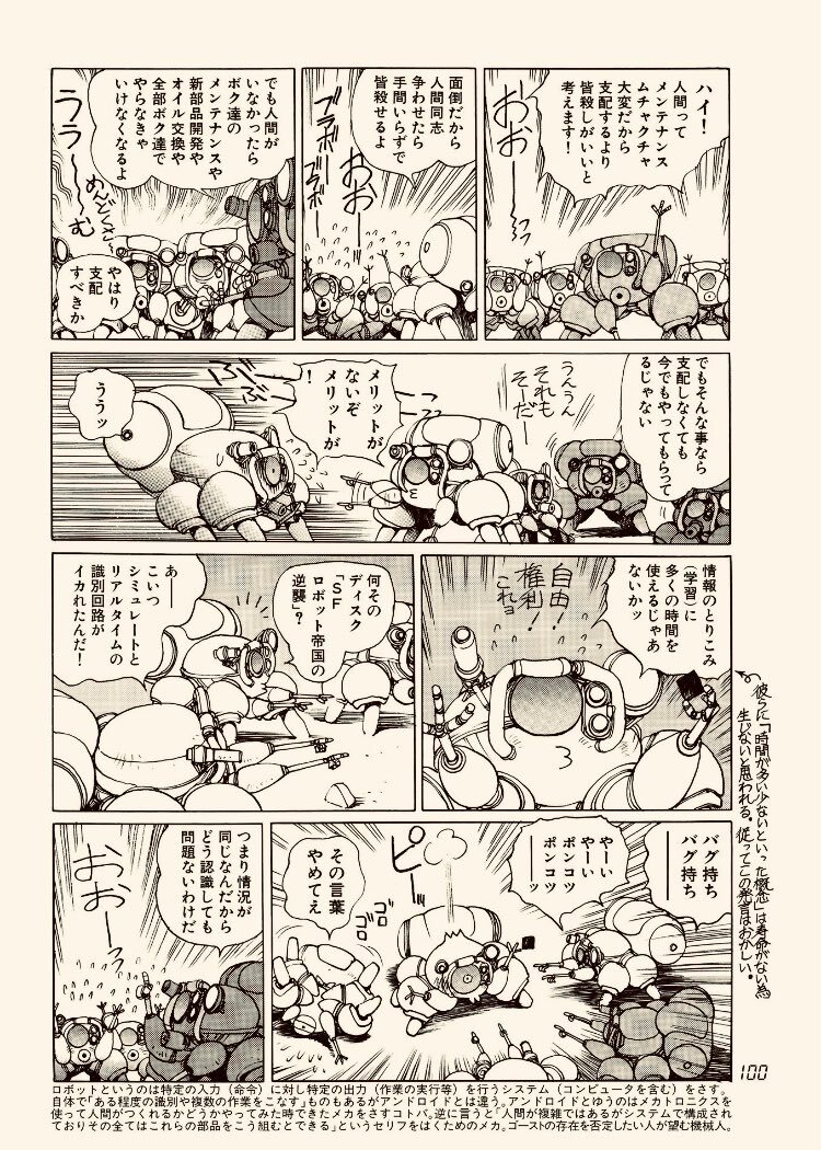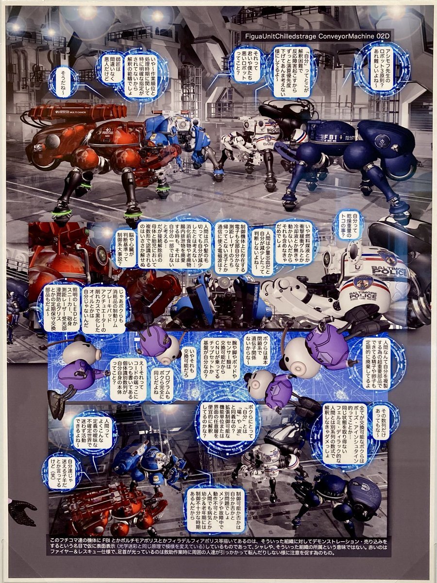 人工知能同士の会話 士郎正宗『攻殻機動隊』でのシーンだが原作フチコマだけではなくアニメ攻殻SACのタチコマでも似た様なシーンが有る エロ画集『W・TAILS CAT』の7巻でもっと濃厚な会話が堪能できるらしいが未発売の巻。 今回【士郎正宗の世界展】で読めたのは良い経験だった #士郎正宗の世界展 pic.x.com/NDnOq5hmzt