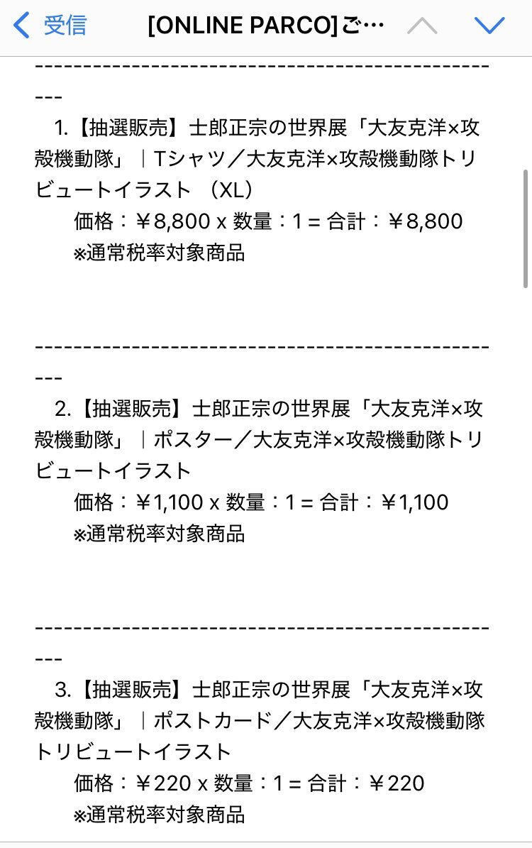 【士郎正宗の世界展】 『大友克洋×攻殻機動隊』コラボグッズ、PARCO公式ECサイトでとりあえず抽選に応募しといたー online.parco.jp/shop/e/e327799… これ1注文に3種類(Tシャツ・ポスター・ポストカード)入れちゃったけどハズレる時は全部ハズレるんやろな。注文分けた方が良かったかな #士郎正宗の世界展 pic.x.com/264uGzPUXG