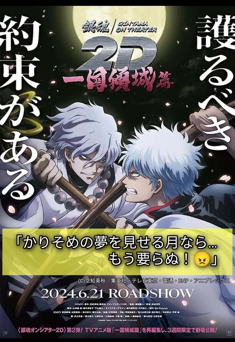 〜「かりそめの夢を見せる月なら…もう要らぬ!😠」〜 (C)空知英秋/集英社・テレビ東京・電通・BNP・アニプレックス #声に出して読みたい映画のセリフ #声読み #知ってる映画だったらRT #知らない映画でもRT #銀魂 #銀魂オンシアター2D #銀魂オンシアター #一国傾城篇 pic.x.com/EfyVdnvBIq