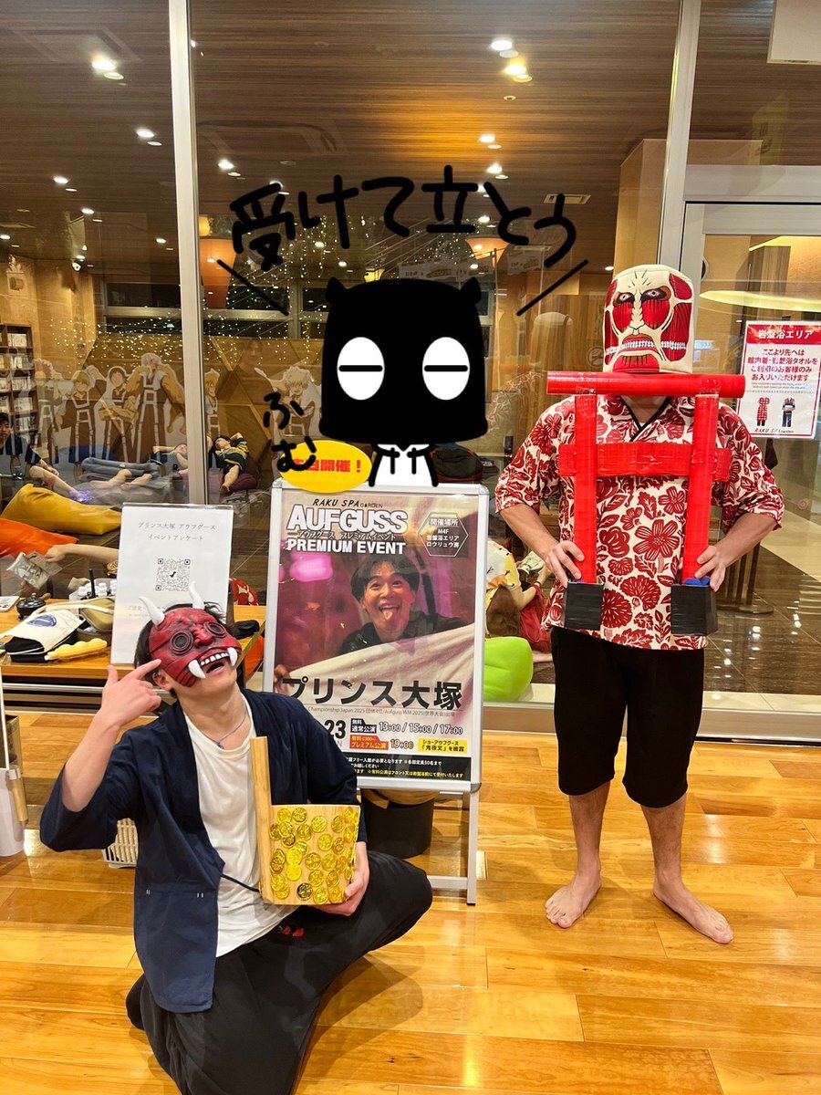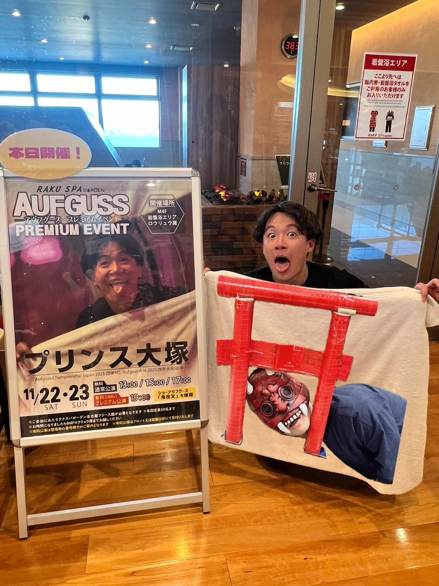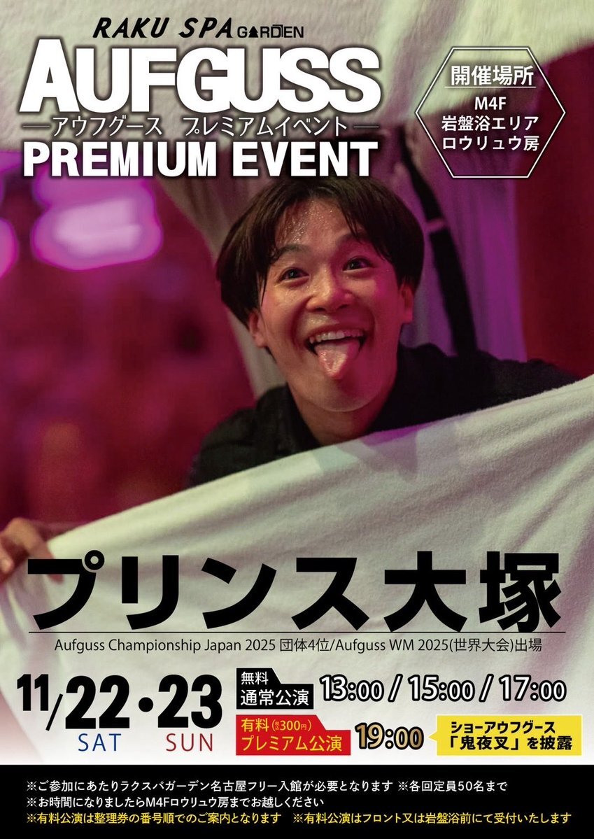 プリンス大塚🤴殿プリンスグース🔥in RAKU SPA 名古屋 迫力ある投げ技に魅了され香りも堪能😊 初披露の鬼夜叉👹ショー👍 12月イベントも凄い 12/13(土)14(日) 永井テツヤさん 12/28(日)しゃけのこ (鮭山未菜美さん/のこのこ窪田さん) #ハク活89活 #変態サウナの輪を広げよう #松岡愛のサウナで乾杯! pic.x.com/RHOpwnZakm x.com/prince37sauna/…