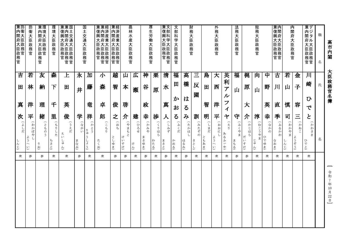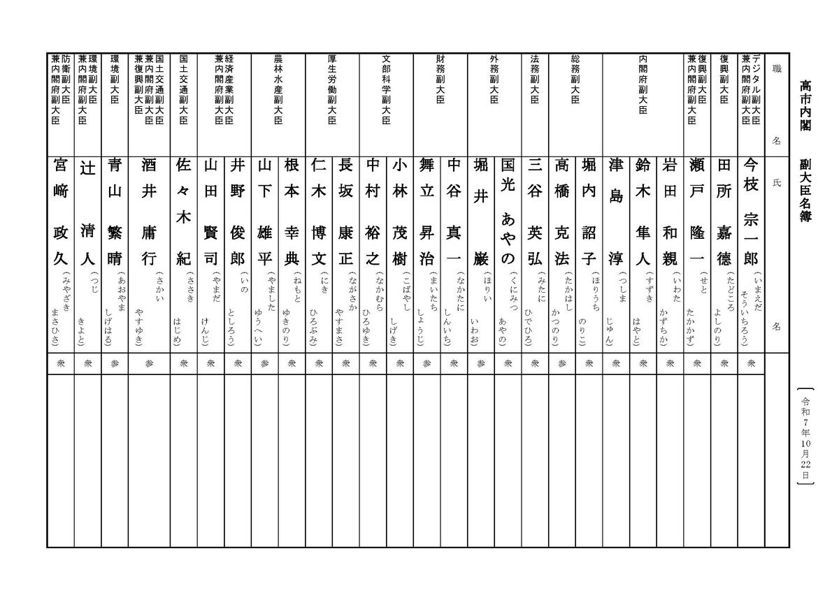 【お知らせ】 高市内閣の副大臣、大臣政務官名簿を掲載します。
