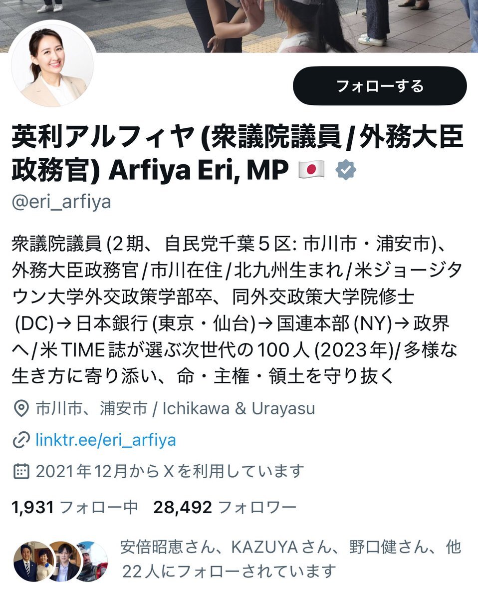 英利アルフィヤ(衆議院議員) Arfiya Eri, MP@eri_arfiya