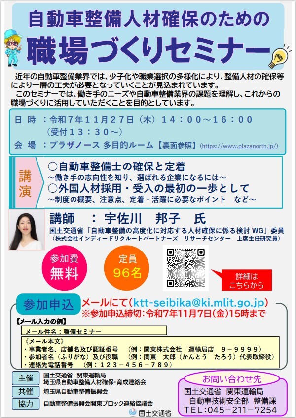 関東運輸局です🚗 11月27日(木)埼玉県にて、 自動車整備事業の経営者を対象とした 自動車整備人材確保のための職場づくりセミナーを開催します。 詳細は次のリンク先をご覧下さい。 wwwtb.mlit.go.jp/kanto/press/da… #国土交通省 #関東運輸局 #自動車整備事業 #人材確保 #外国人採用 pic.x.com/WRv5HN0P3I