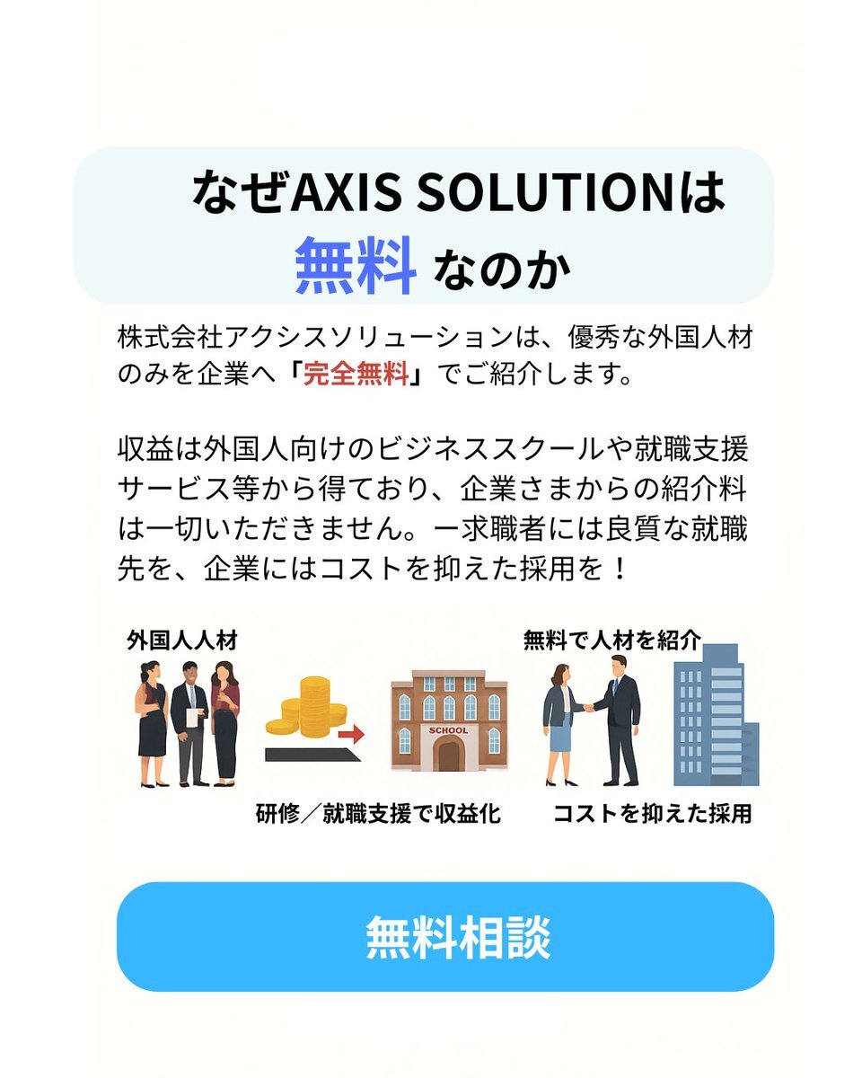 人手不足でお困りの企業様、 案件はあるけど、人材が足りない人材紹介会社様、 是非、当社に一度ご相談ください。 貴社の採用プランに合わせて、 最適な人材をご提案させていただきます。 DMもしくはHPよりお気軽に無料相談ください。 axissolution.jp/contact-us/ #人材紹介 #製造業 #外国人採用 pic.x.com/MfrhkmyDo7