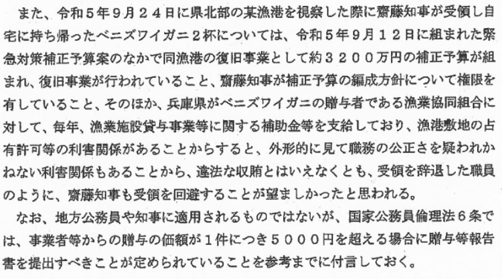 返信先:@chi09721018この #ベニズワイガニ の件については、#おねだり の話ではなく、(利害関係者から)貰ったか貰ってないかの話。#斎藤知事 は辞退した職員の分まで持ち帰りと第三者委員会で事実認定。少なくとも #外形的公正性 が疑われる事案と。 pic.x.com/xU6tSSGpSV x.com/chi09721018/st…