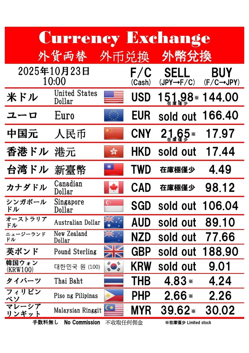 おはようございます #外貨両替フラッグスタッフ です 2025年10月23日(木)の両替レートです Skypeサービス終了に伴い「050-5539-9999」の提供が終了しました 今後は eメール info@flagstaff.co.jpにてお問い合わせ願います 宜しくお願い致します #横浜 #中華街 #海外旅行 #外貨両替 #exchange #yokohama pic.x.com/RNNzL9zQf3