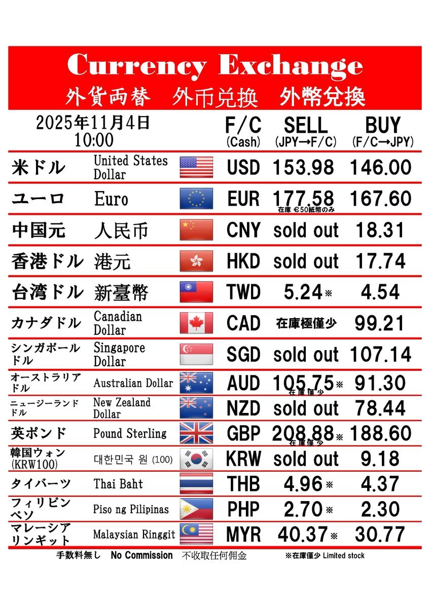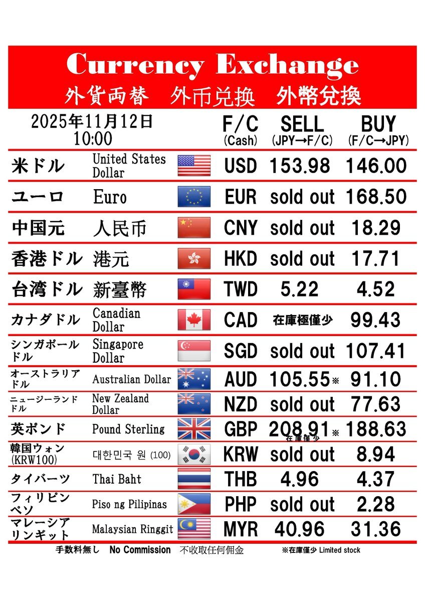おはようございます #外貨両替フラッグスタッフ です 2025年11月1日(土) の両替レートです Skypeサービス終了に伴い050-5539-9999の提供が終了しました 今後は eメール info@flagstaff.co.jp へお問い合わせ願います 宜しくお願い致します #横浜 #中華街 #海外旅行 #外貨両替 #exchange #yokohama pic.x.com/1jfnJu0T6Y
