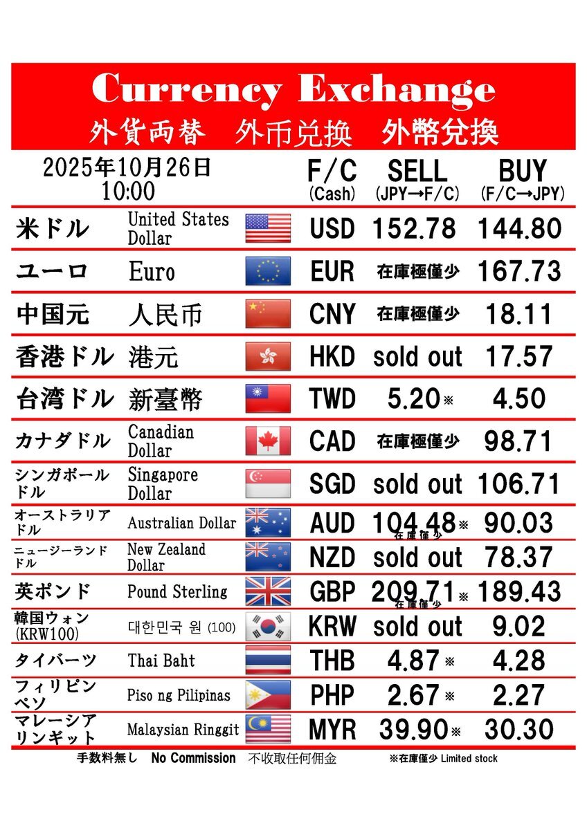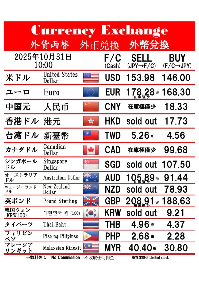 おはようございます #外貨両替フラッグスタッフ です 2025年10月31日(金)の両替レートです Skypeサービス終了に伴い「050-5539-9999」の提供が終了しました 今後は eメール info@flagstaff.co.jpにてお問い合わせ願います 宜しくお願い致します #横浜 #中華街 #海外旅行 #外貨両替 #exchange #yokohama pic.x.com/yxTEGnwkwM