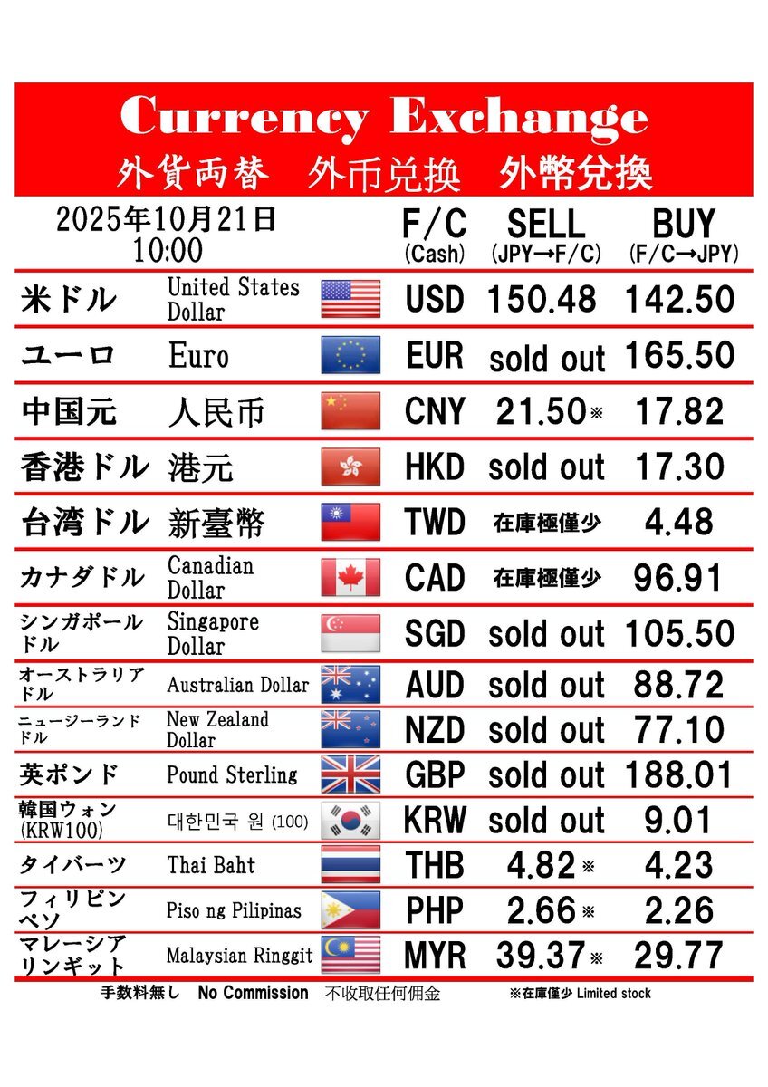 おはようございます #外貨両替フラッグスタッフ です 2025年10月21日(火)の両替レートです Skypeサービス終了に伴い「050-5539-9999」の提供が終了しました 今後は eメール info@flagstaff.co.jpにてお問い合わせ願います 宜しくお願い致します #横浜 #中華街 #海外旅行 #外貨両替 #exchange #yokohama pic.x.com/iOeBMmfUHa